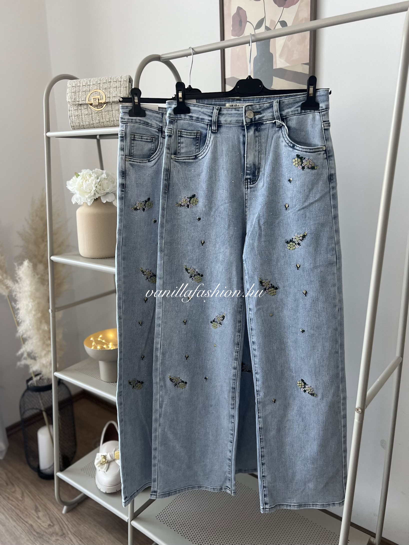 A nadrágot finom hímzés és csillogó strasszkövek díszítik.