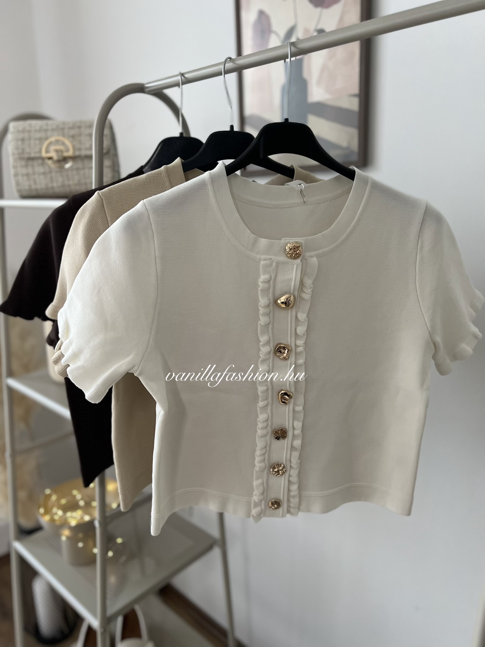 Eva elegáns gombokkal díszített kötött felső.