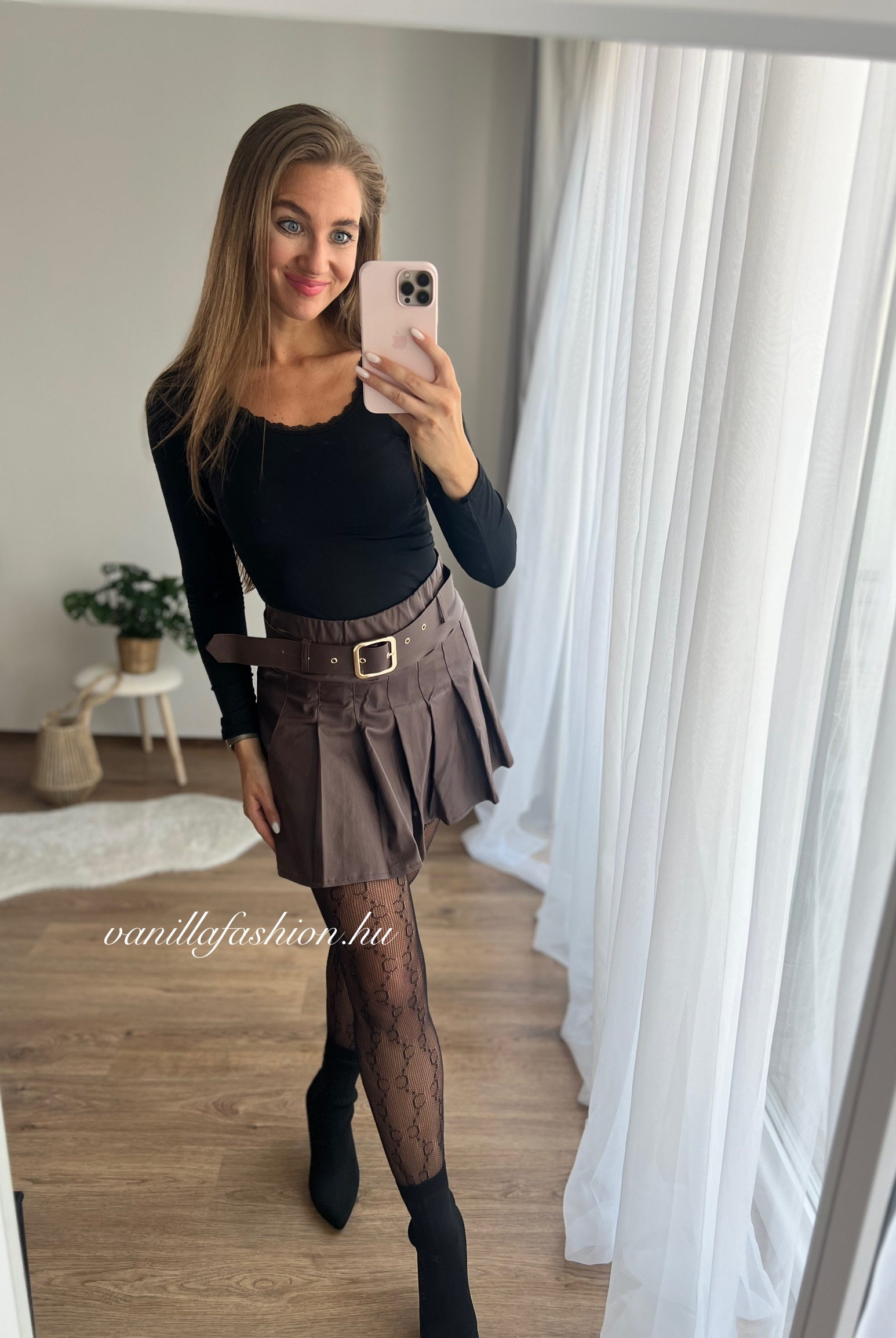 Tökéletes választás őszi-téli outfitekhez, harisnyával és csizmával kombinálva.