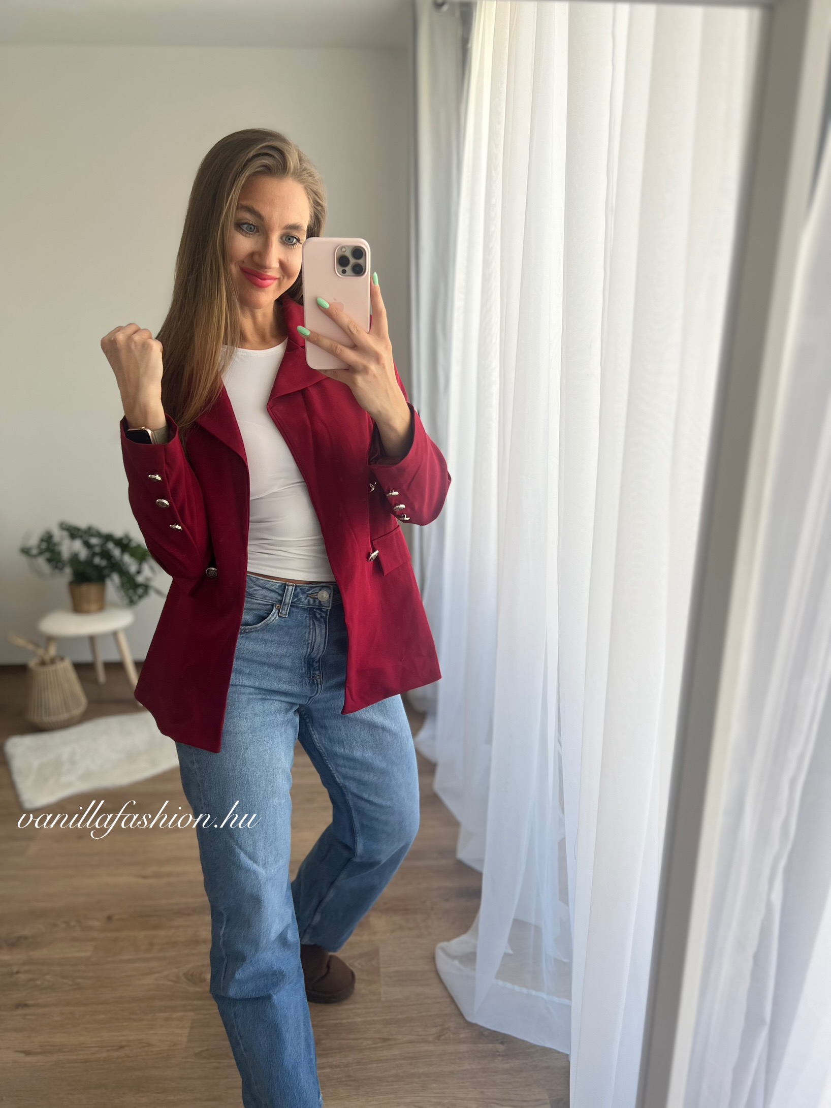 A dekoratív gombok elegáns részletként emelik ki a fazont, míg a karcsúsított szabás optikailag nyújtja az alakot.