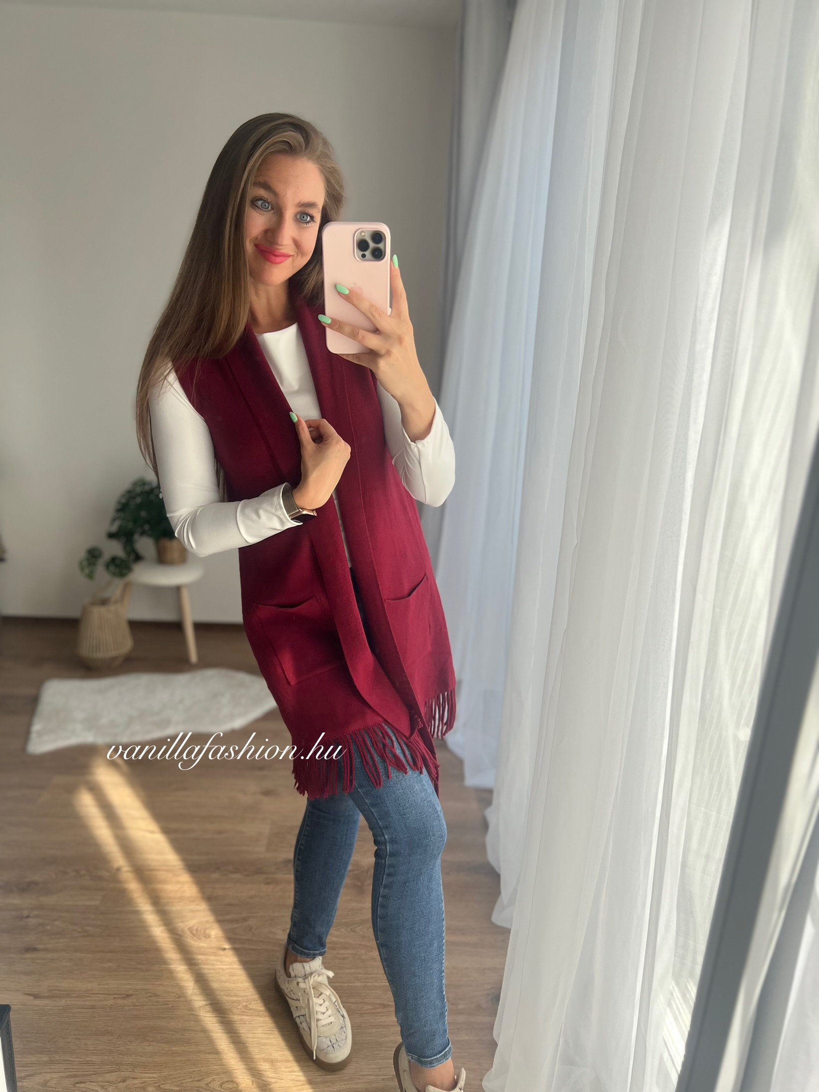 Cinnamon puha, bordó színű kötött mellény tökéletes választás, ha egy egyszerű szettet szeretnél feldobni.