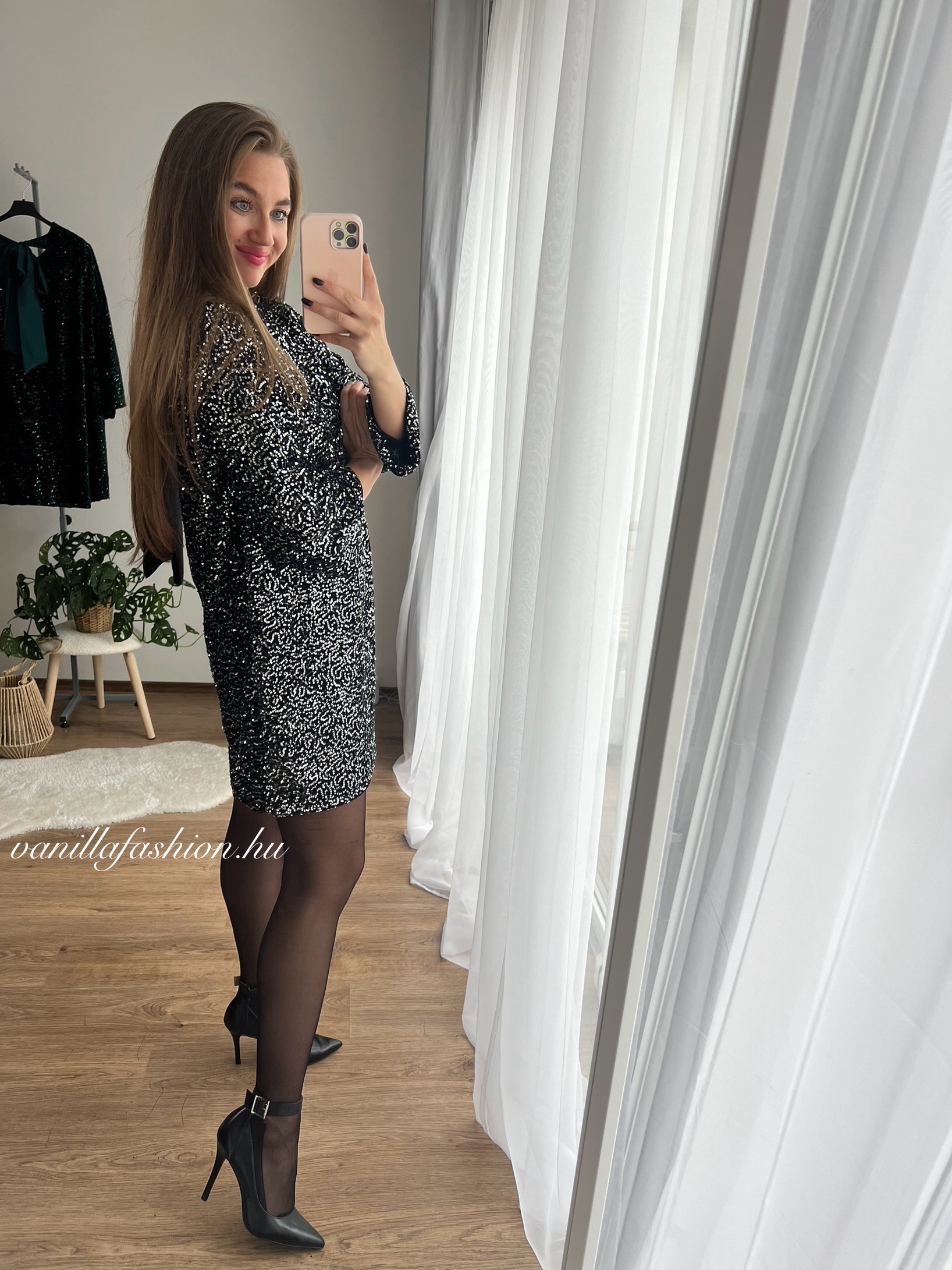 A ruha bársony anyagú, nagyobb méretű flitterekkel díszített. A ruha egyméretes darab XS-M méretig ajánlott.