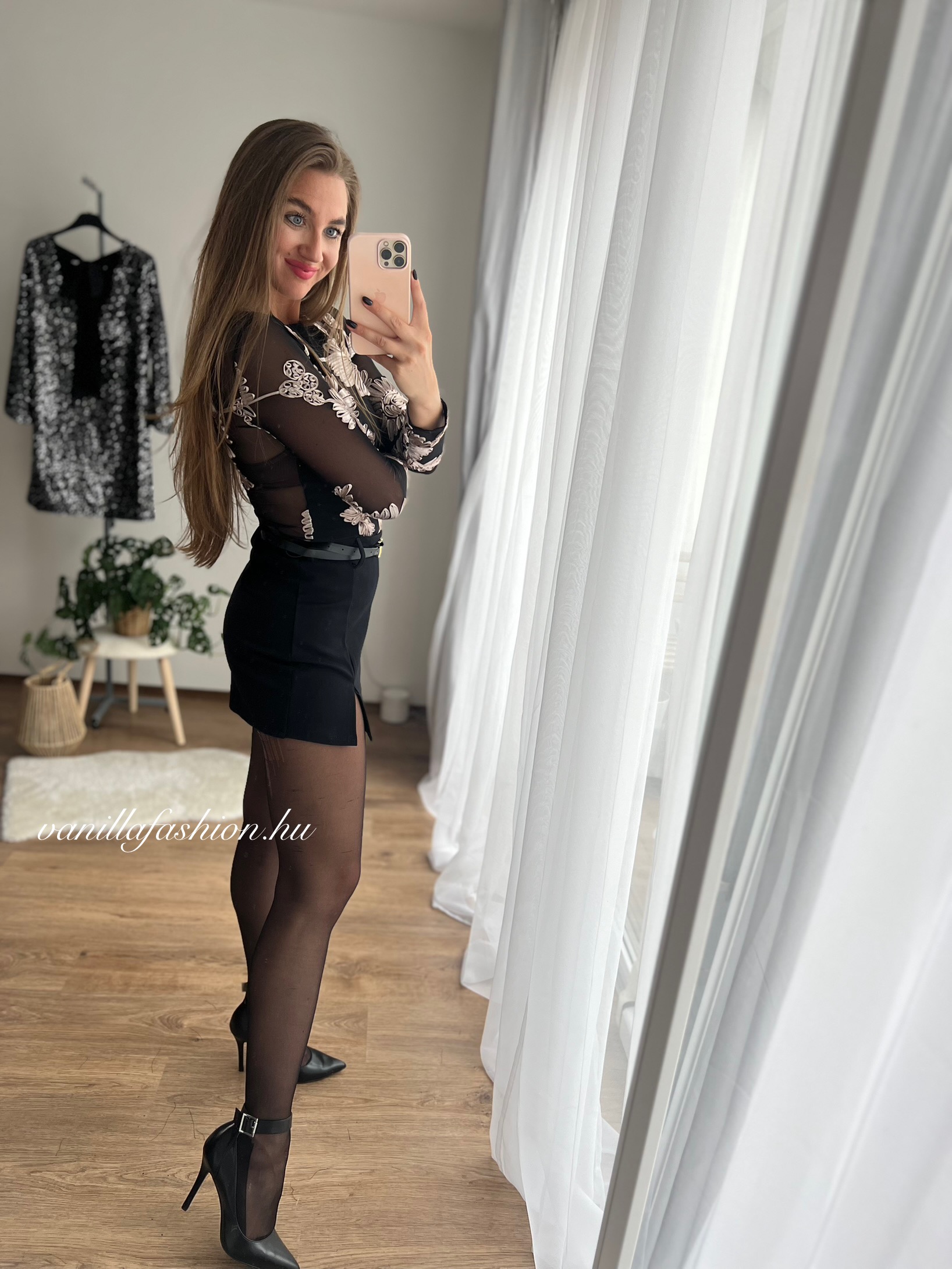 A blúz csak egyik oldalán van bélés, a másik oldala nyitott necc hatású.