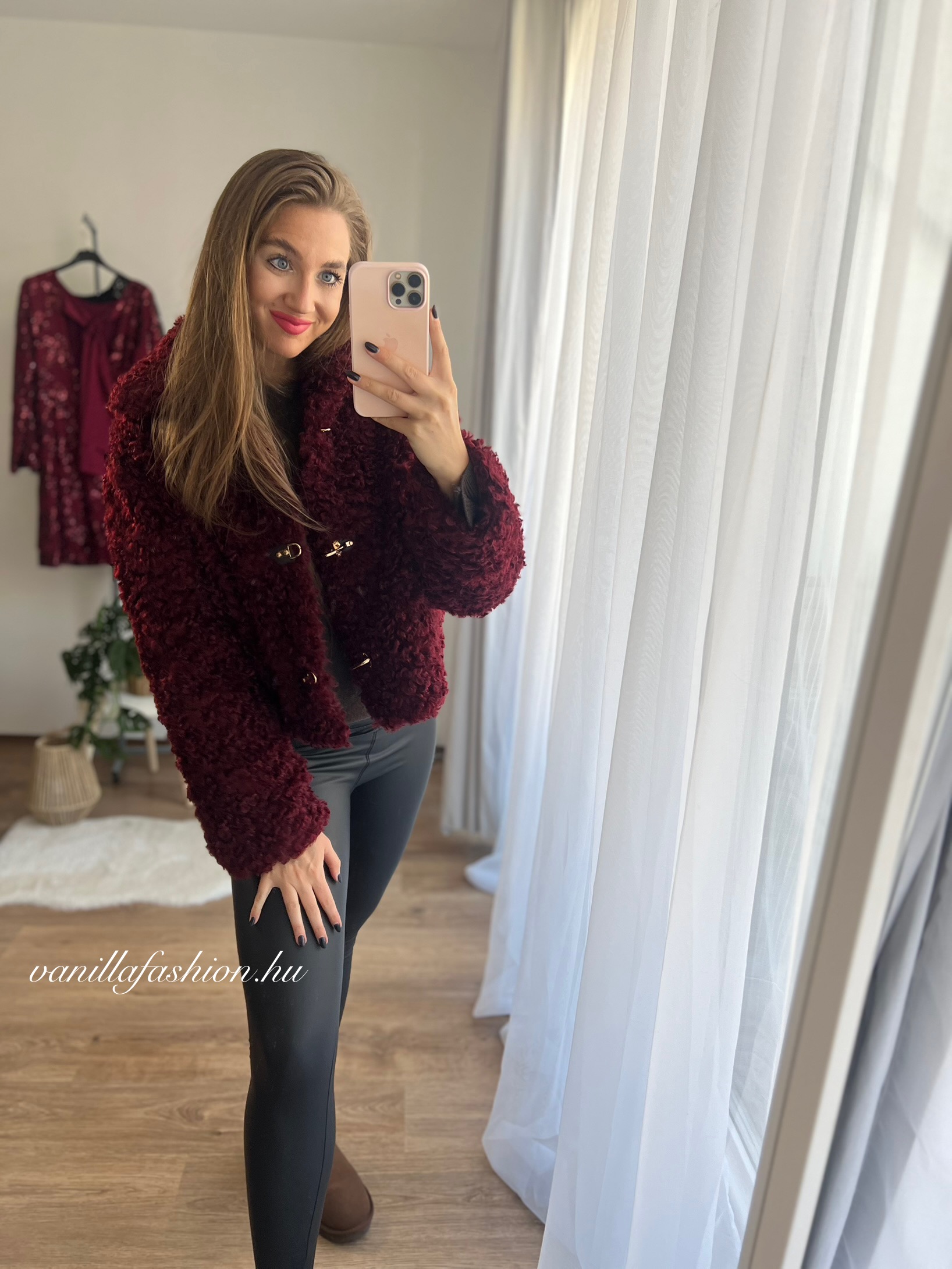 A kabát csatok segítségével zárható, ami praktikus és letisztult megoldást kínál a mindennapi viselethez.