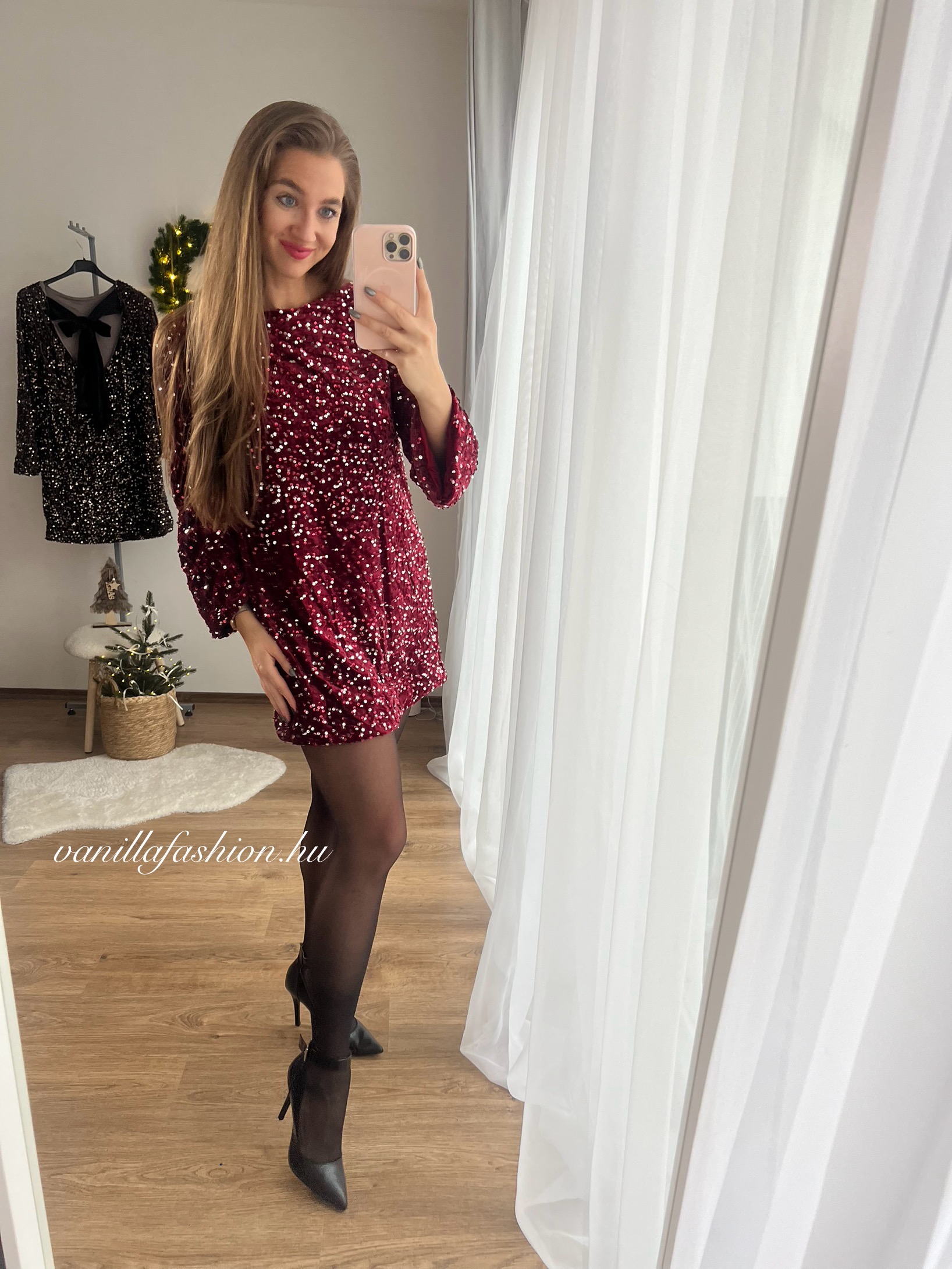 A ruha bársony anyagú, nagyobb méretű flitterekkel díszített. A ruha egyméretes darab XS-M méretig ajánlott.