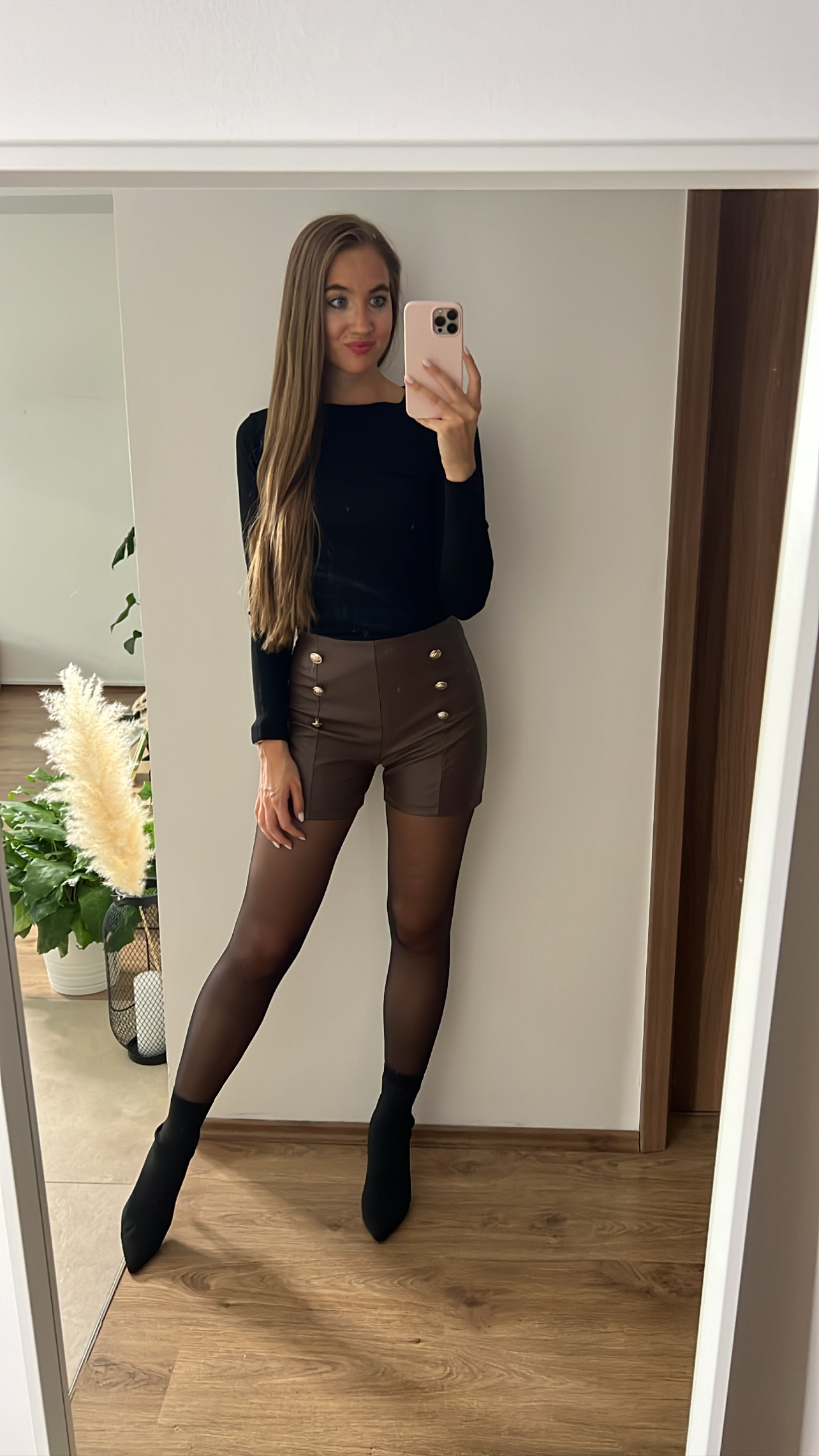 Bőr hatású rövidnadrág, gombokkal díszítve. Oldalán cipzár található.