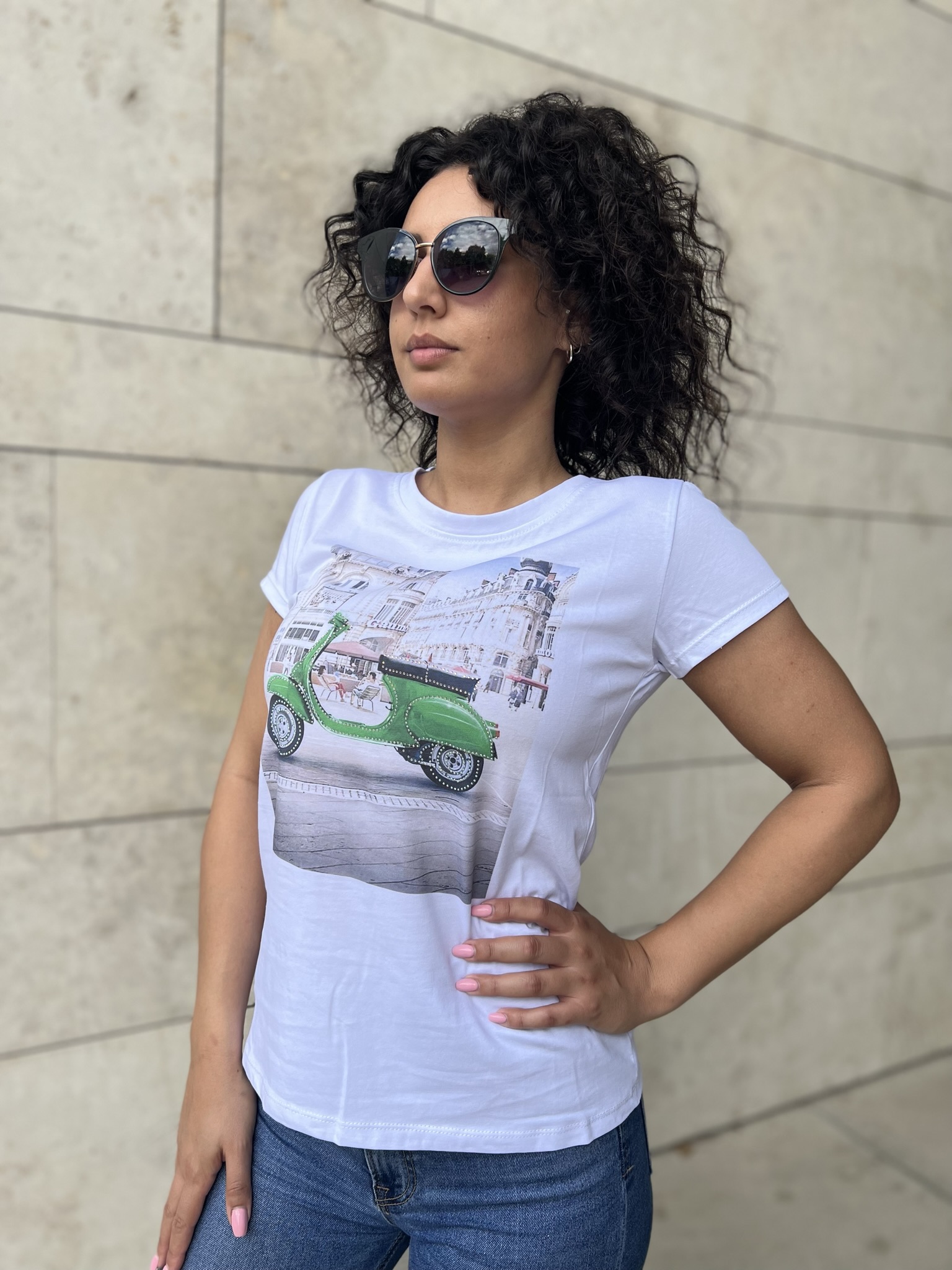 Rövid ujjú mintás felső, egyméretes darab Xs-M méretig ajánlott.