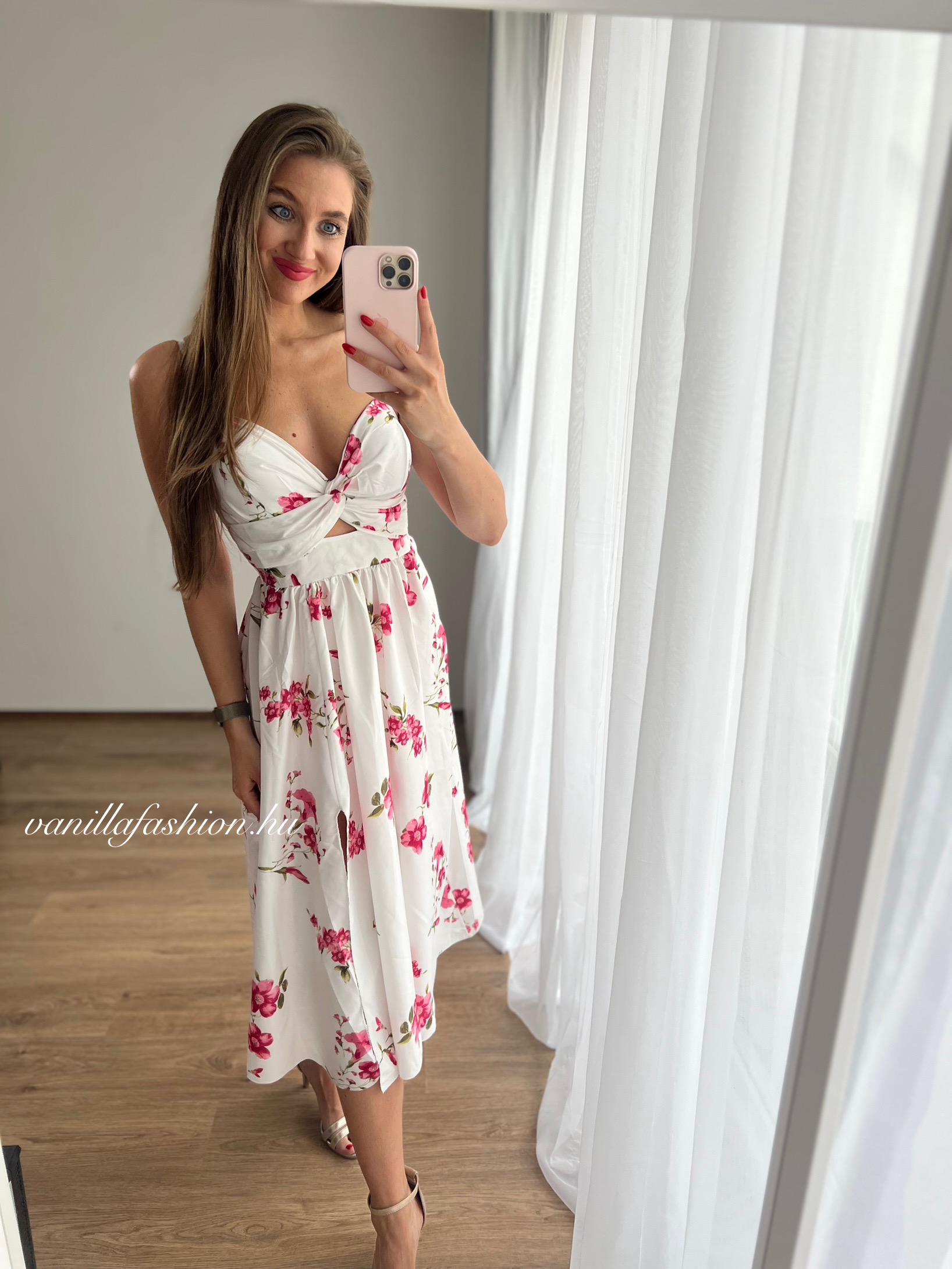 Estella virágmintás midi ruha tökéletes választás nyári napokra vagy különleges alkalmakra.